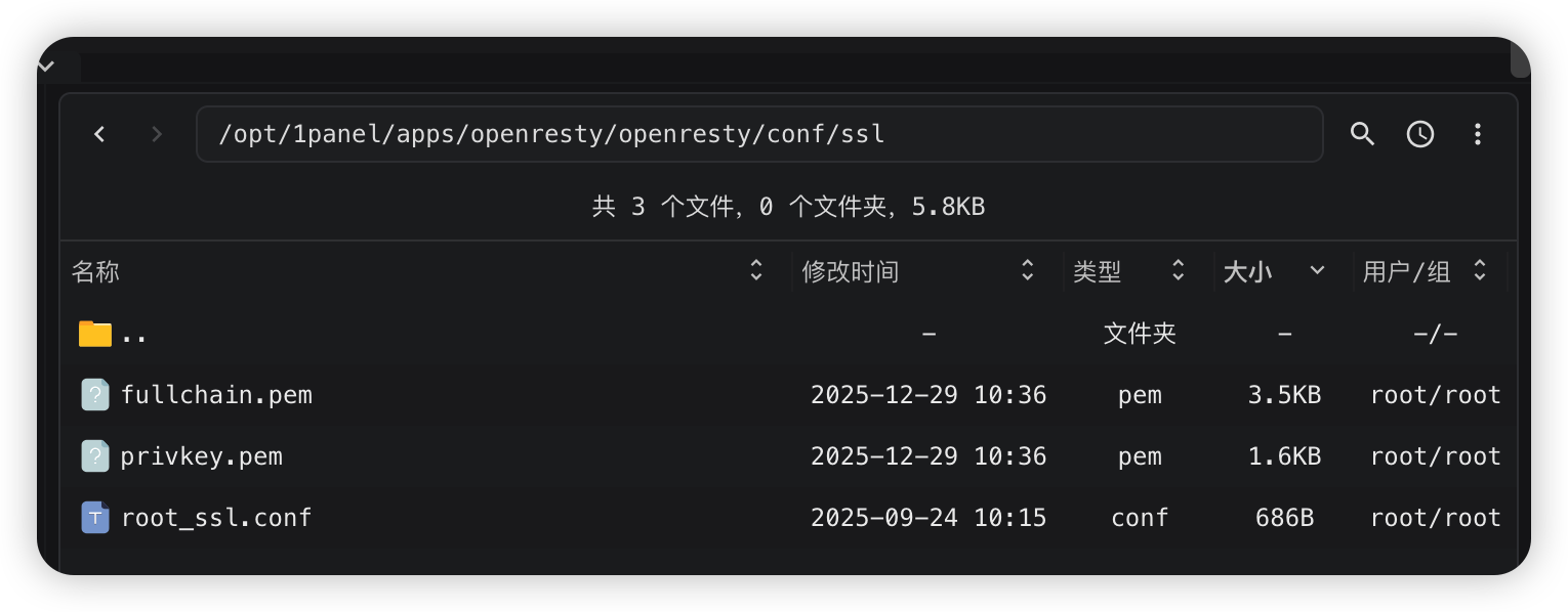 我只找到了这个 ssl 目录,我直接替换了那两个证书文件,现在显示的是最新的,但是重启面板之后浏览器拿到的证书还是之前的,之前的证书是保存在这个位置的吗,有什么办法直接替换之后能生效的?