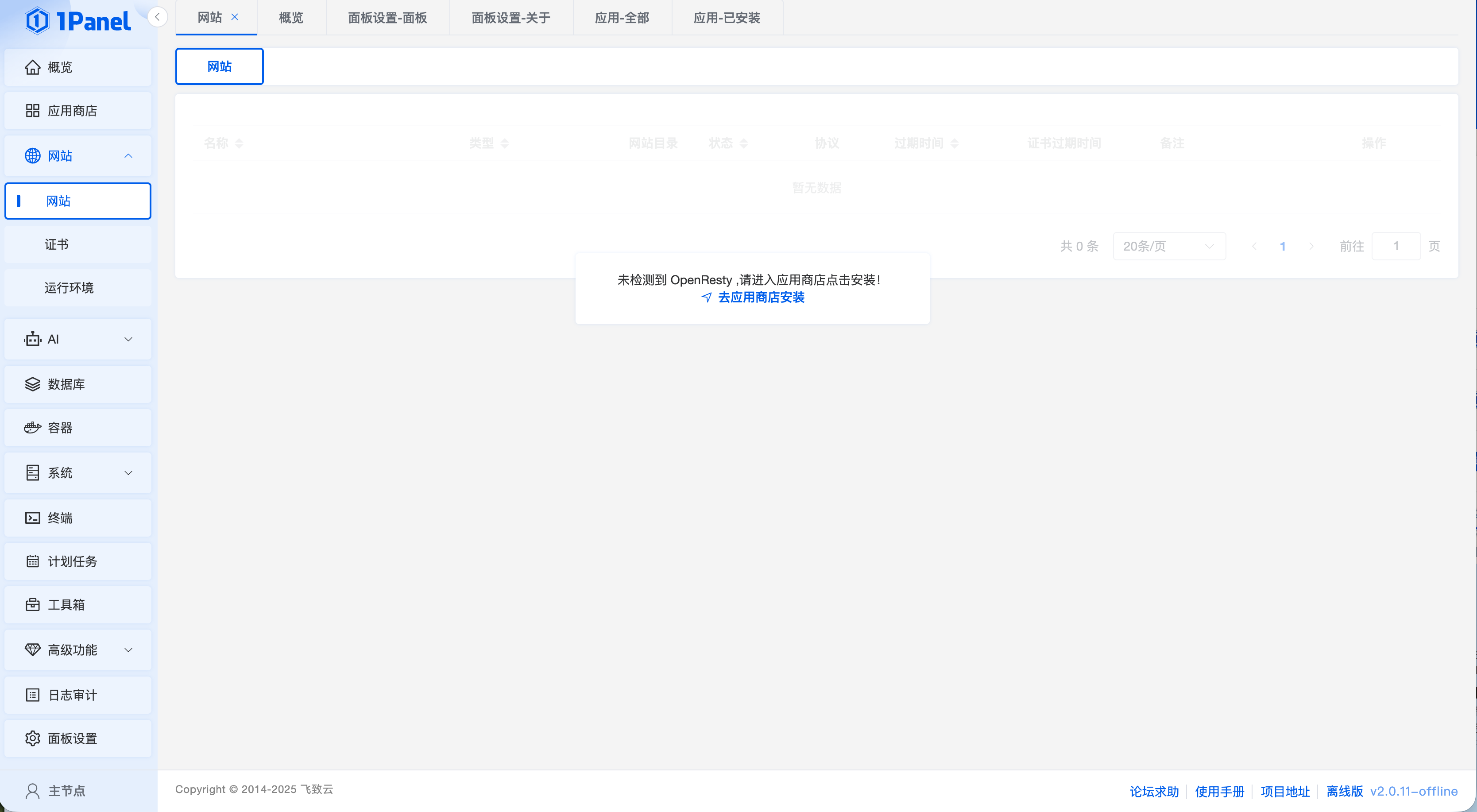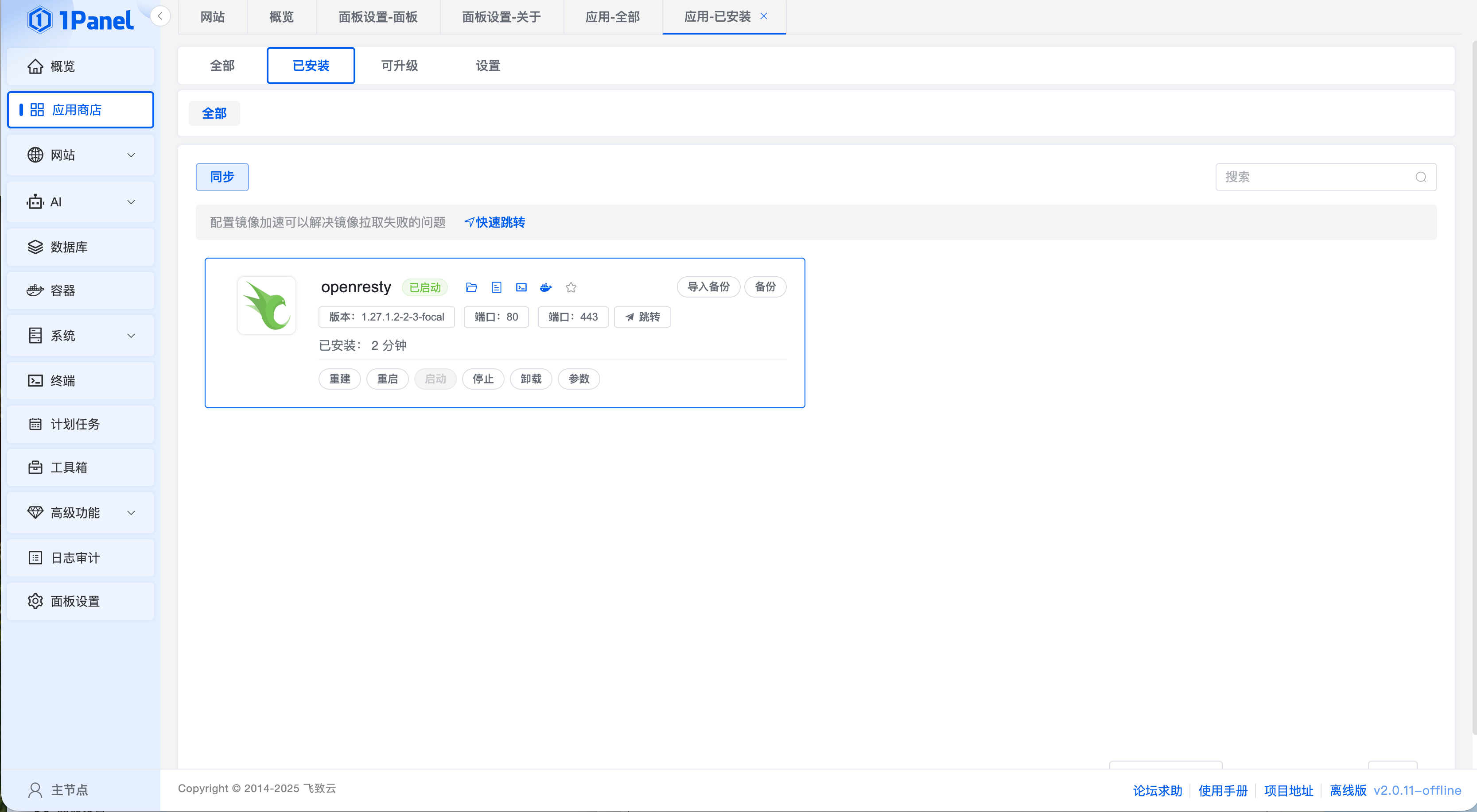 1Panel 版本:离线版 v2.0.11-offline