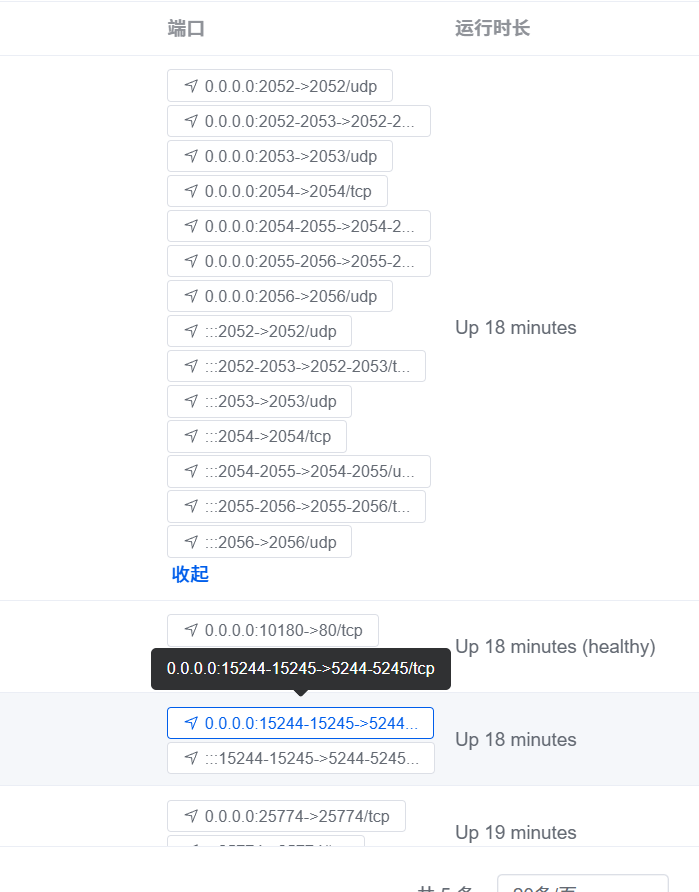 2.这个连续端口合并显示从很久以前就有问题,假如同时映射几个连续的端口,会合并成port-port的样式,没有问题,但是如果同时映射几个连续的端口的tcp和udp,这就乱套了,会有各种各样的显示方式,图一只是其中一种。