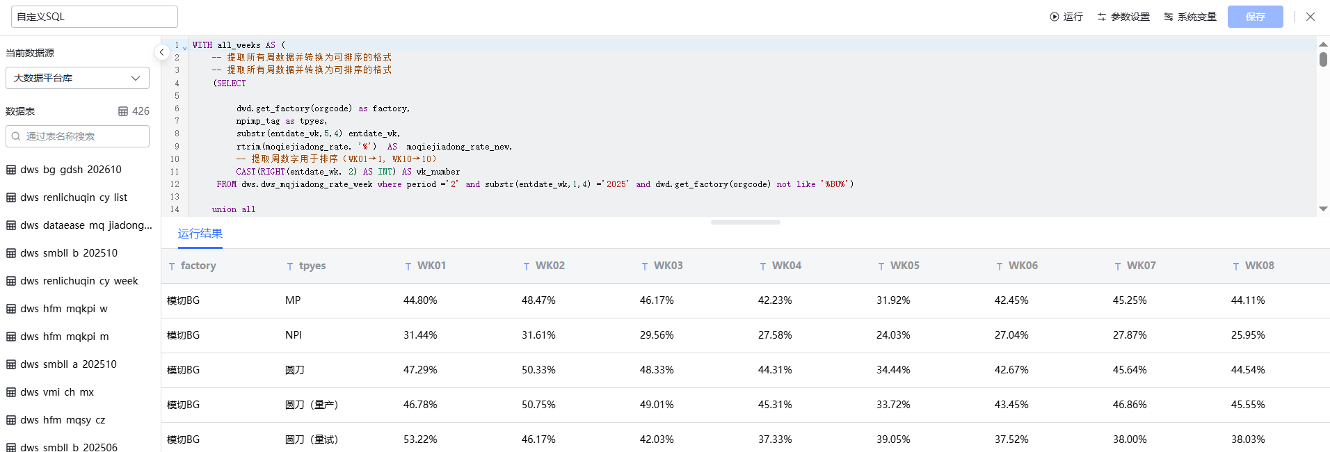 FROM dws.dws_mqjiadong_rate_week where period ='2' and substr(entdate_wk,1,4) ='2025' and dwd.get_factory(orgcode) not like '%ccc%' and npimp_tag ='ALL'