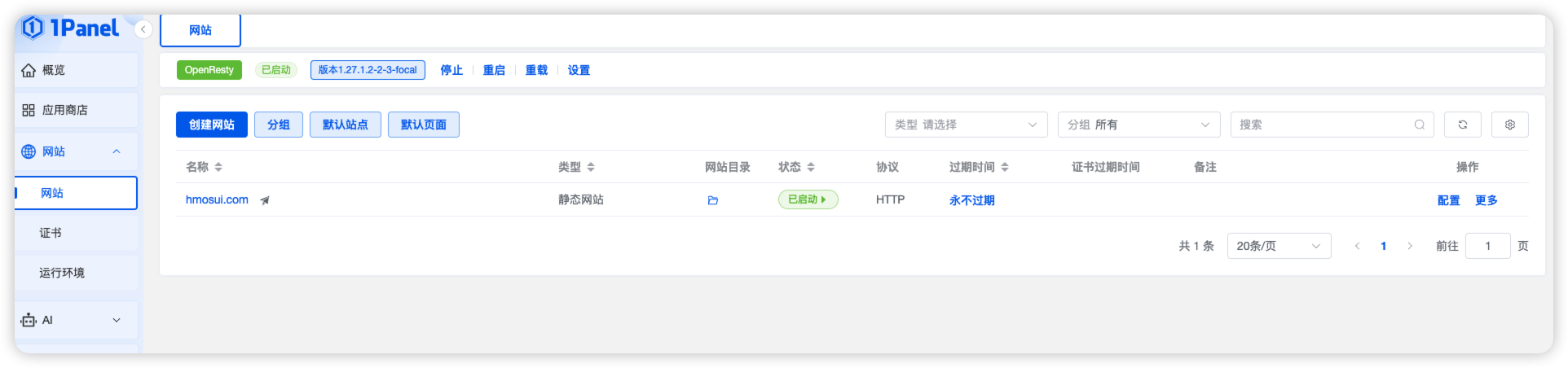 没有多余操作,直接安装最新版本OpenResty ,然后创建一个静态网站,不勾选https。域名解析绝对没问题。现在只想跑通最简单的流程,全部用默认的,都没有办法访问成功。一直进入404界面。