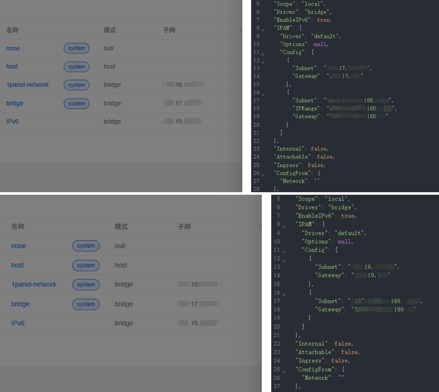 在创建网络时我看现有的“bridge”和“1panel-network”的【子网】只是改变了第二位小数点的数字如:从17变成了18