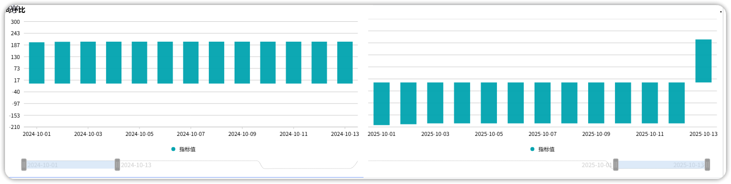 当我需要计算本月同比时,快速计算的同环比设置,只能设置到去年同月数据(日期格式选择年月),去年同月数据的结果是整月。在过滤中也无法动态设置到需要的时间。而对于本月的同比来说,是以上年同期为基期相比较,即本期某一时间段(点)与上年某一时间段(点)相比。举例:今天为2025年10月13日,我们做本月同比时,一般会取截止昨日已经完成的数据,即统计2025年10月1日至10月12日的指标和去年同期2024年10月1日至10月12日的指标做对比计算。