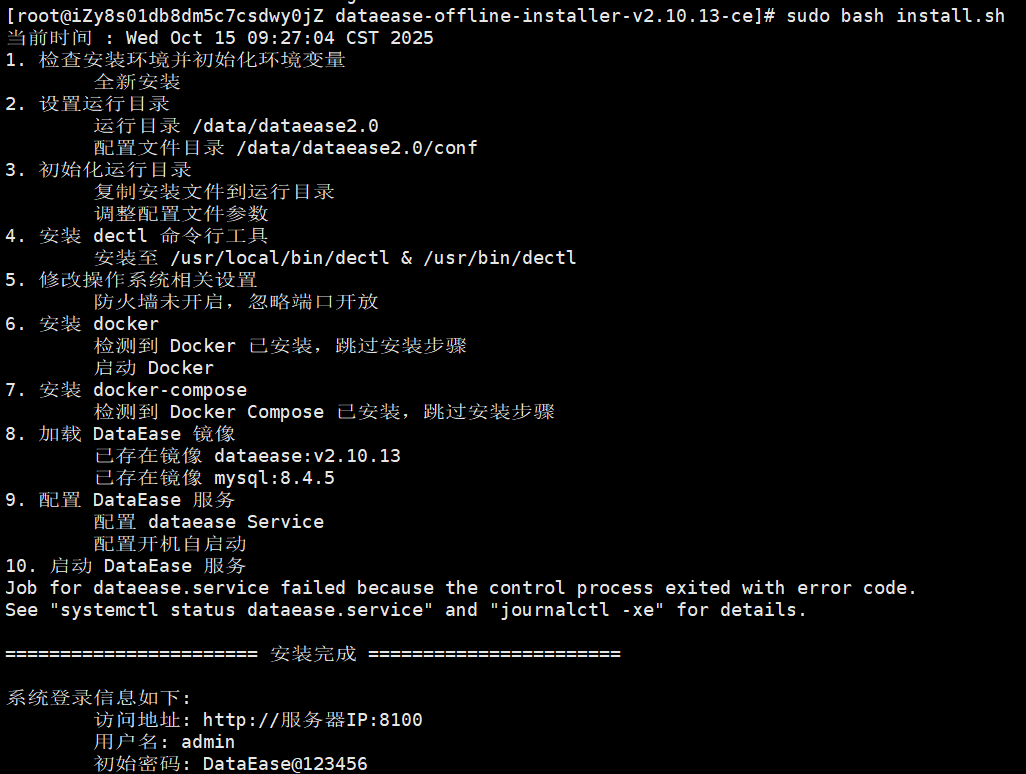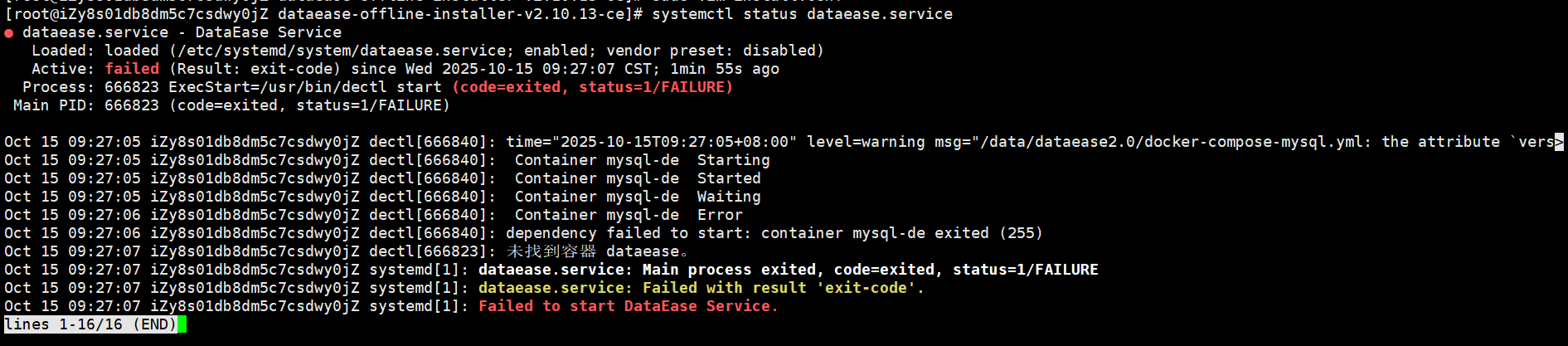 在内网离线部署DataEase最新版,出现Job for dataease.service failed because the control process exited with error code.See “systemctl status dataease.service” and “journalctl -xe” for details.如下图: