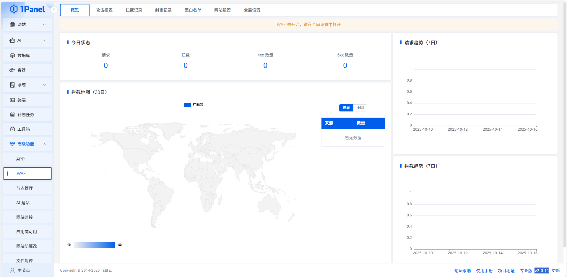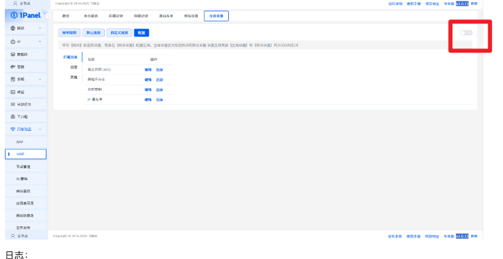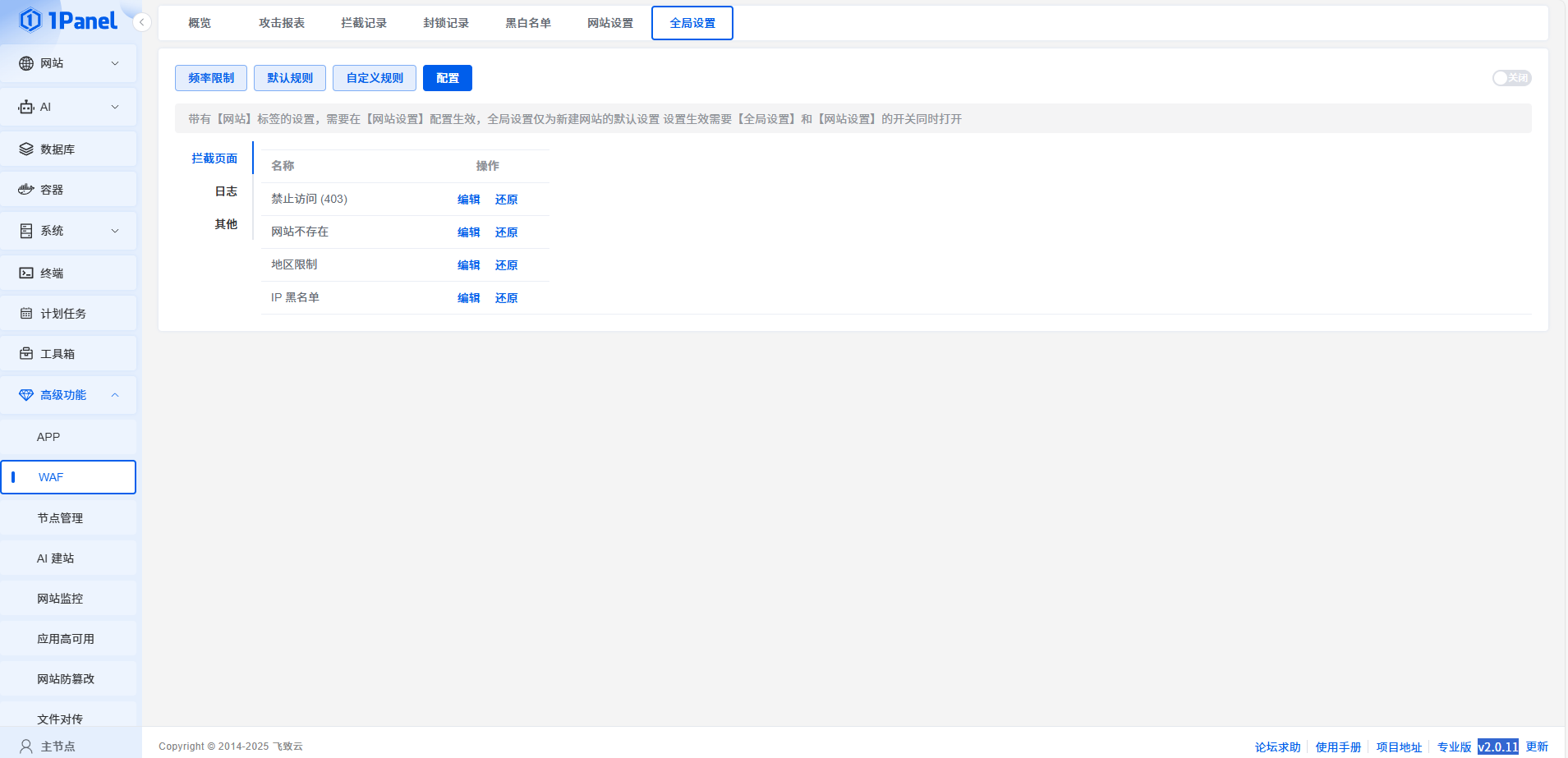 如何开启waf,面板显示“WAF 未开启,请在全局设置中打开”,但是全局设置中没有找到开关 1Panel 版本:v2.0.11 操作系统:Alibaba Cloud Linux 3.2104 LTS 64位 关键截图: