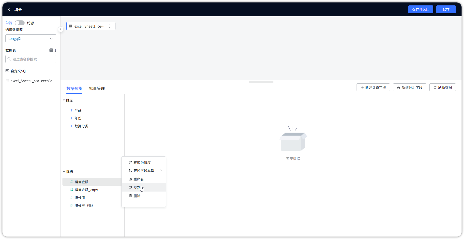 几个问题:我想通过 透视表/汇总表 显示出来销售额的月同比 和原始值 。 然后我发现销售额放到 透视表/汇总表 后,改成月同比就无法显示原始值了。而且同一个指标只能拖一次,不能重复添加。有什么好办法吗?