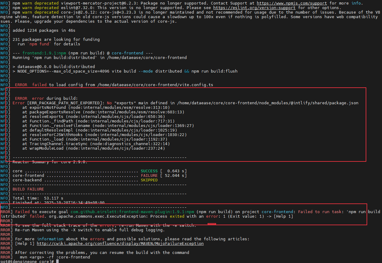 打包项目时,在core模块,前端npm时,报错。在尝试删除 node_modules 后一九存在该问题