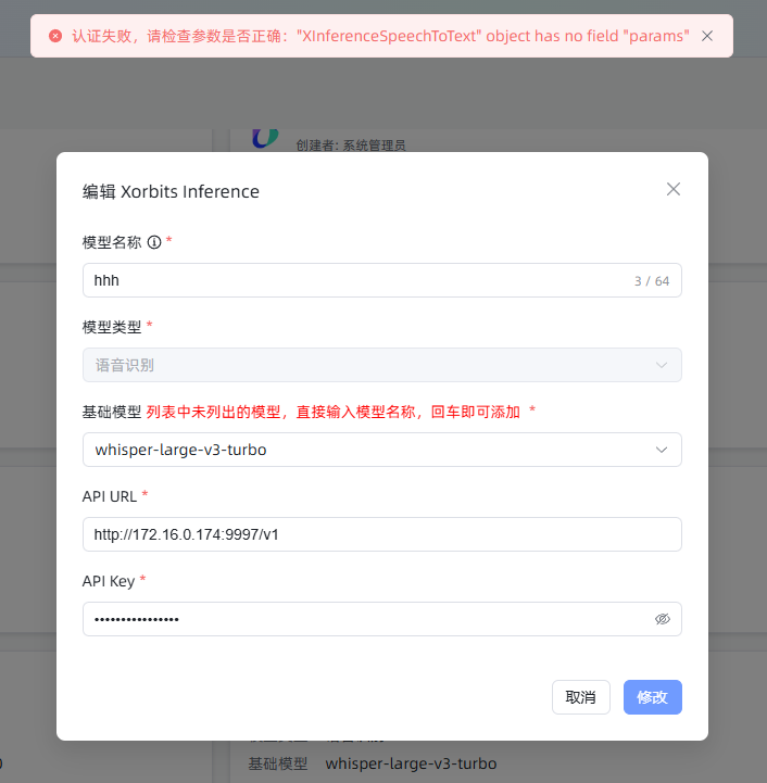 原本已经添加好的模型,而且之前是可以正常使用的,现在点击编辑,然后直接点击修改就会出现以下报错: