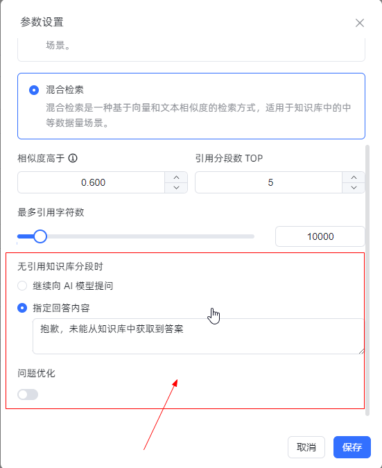 简单模式下,应用设置里可以设置相关选项,但在编排模式下没有找到呀,知识库检索跟ai问答模块都没有,如下如就是无引用知识库分段时如何回答的选项