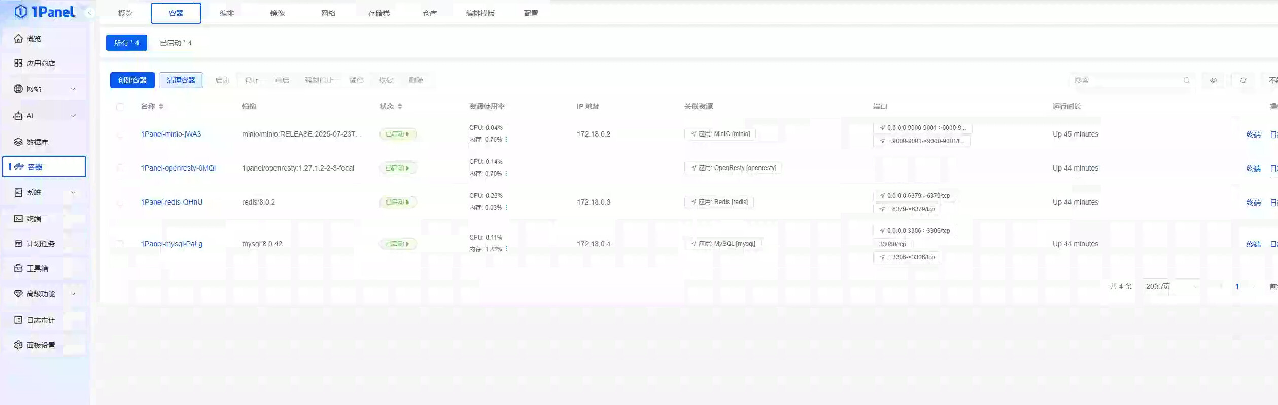 在面板可以连接数MySQL,redis,但是通过ip访问minio访问不了。部署项目,通过容器id,ip,都连接不上数据库。本地无网络情况。