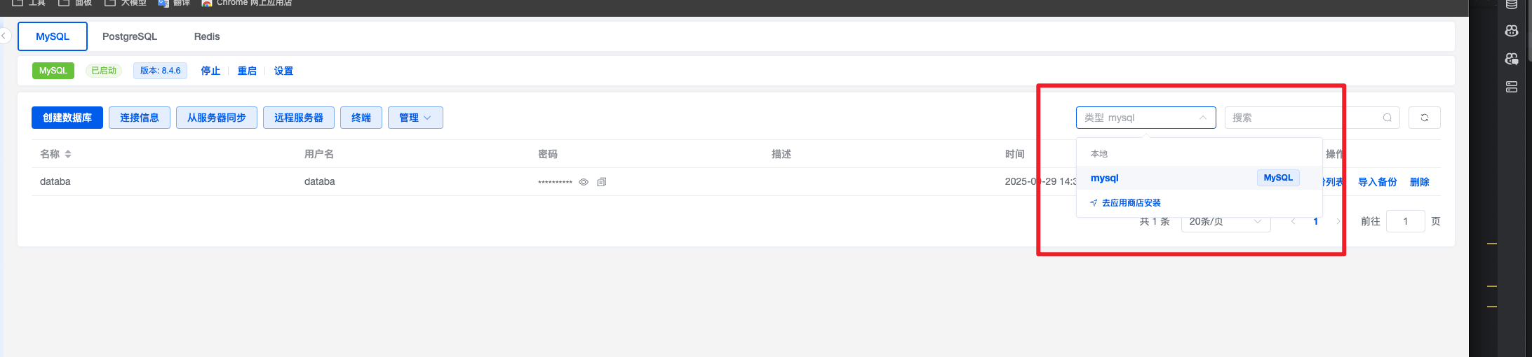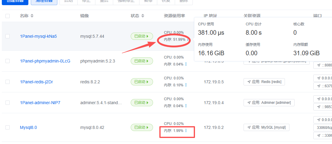 问题1:现在面板左侧菜单 点击数据库 只能看到一个mysql8.0的信息,没有看到切换管理mysql5.7的。能否在数据库中 下拉或者 有个切换按钮 通过面板 管理多个容器的数据库版本?