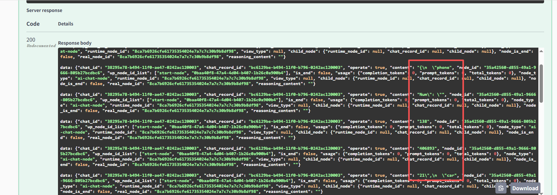 swagger返回的数据,被分割成多条,需要怎么配置? 比如返回phoneNum=13840689321,swagger中返回结果在5条记录中显示,如下图: