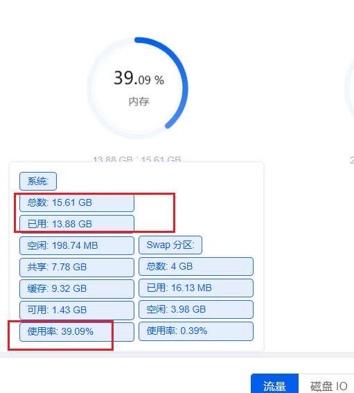 为什么 内存总数15.6 已用13.8 使用率是39%