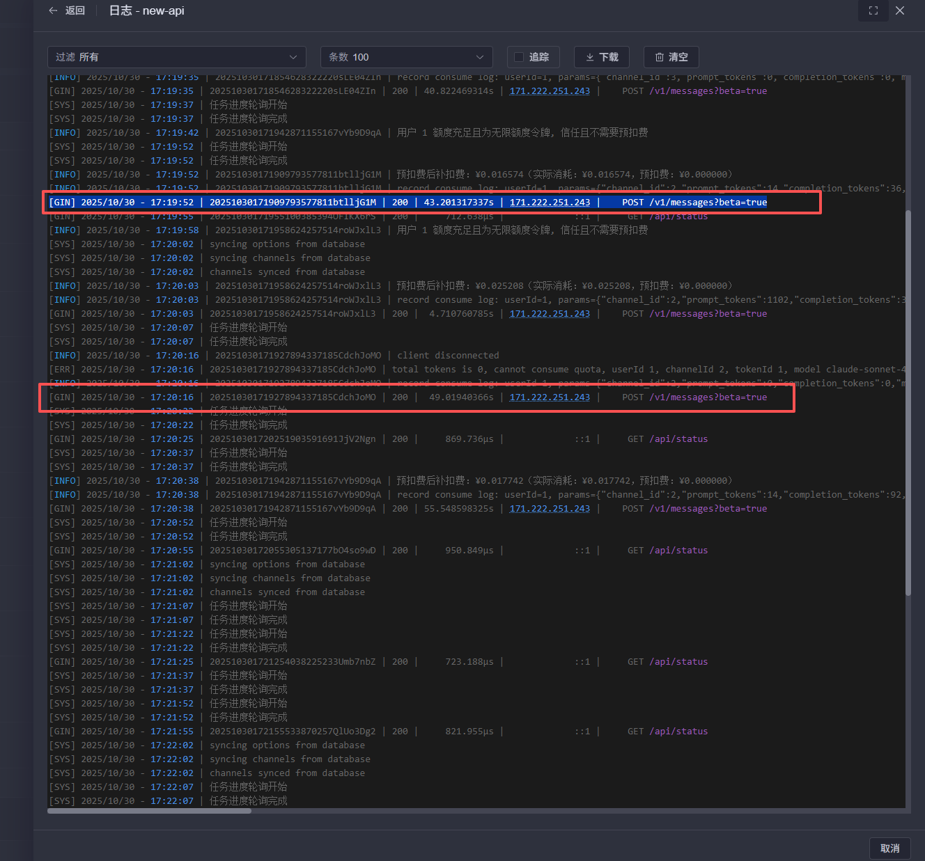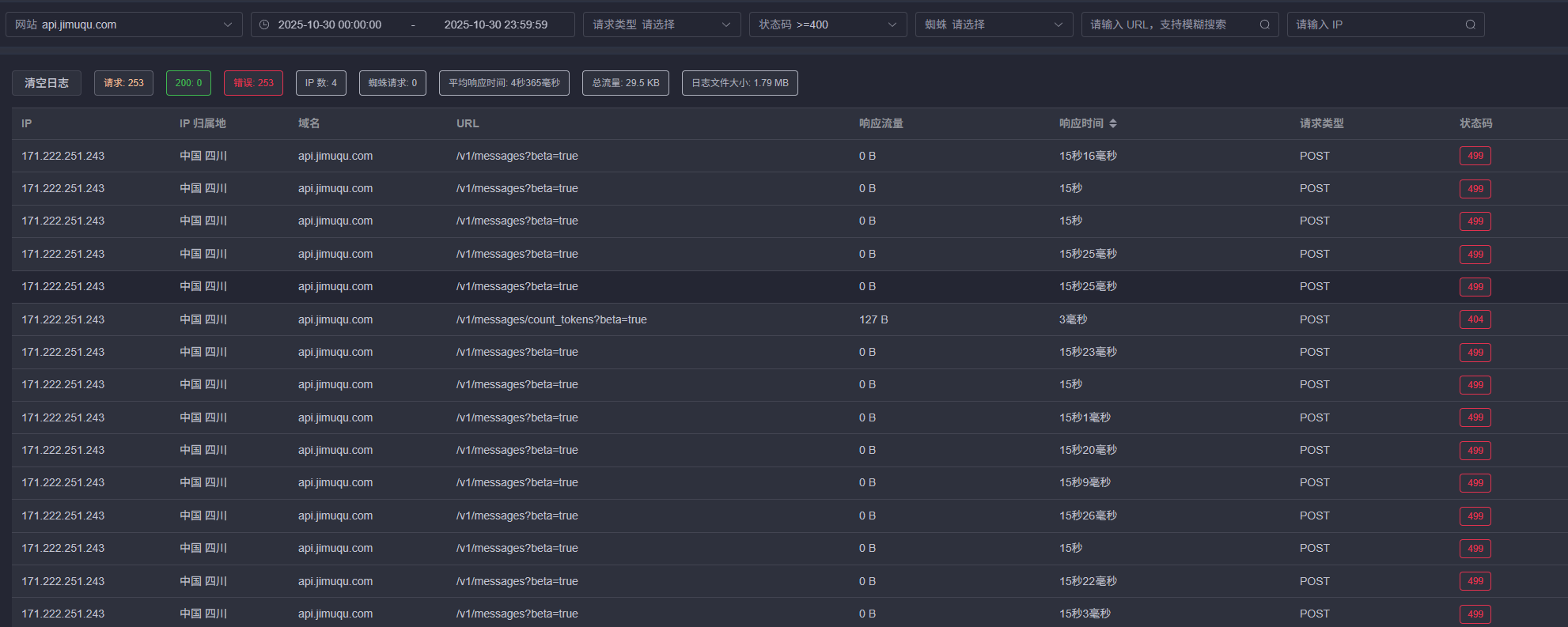 测试过程: 1、claude code直连modelscope 无问题 2、claude 直连 newapi的端口 无问题 3、经过网站的反向代理后单个请求15秒以内无问题,一旦达到15秒或超过 立刻 499状态码,查看newapi的docker日志实际上newapi是依然在正常的执行。最终确定是网站的反向代理存在问题。4、尝试了bt家的面板反向代理测试无问题