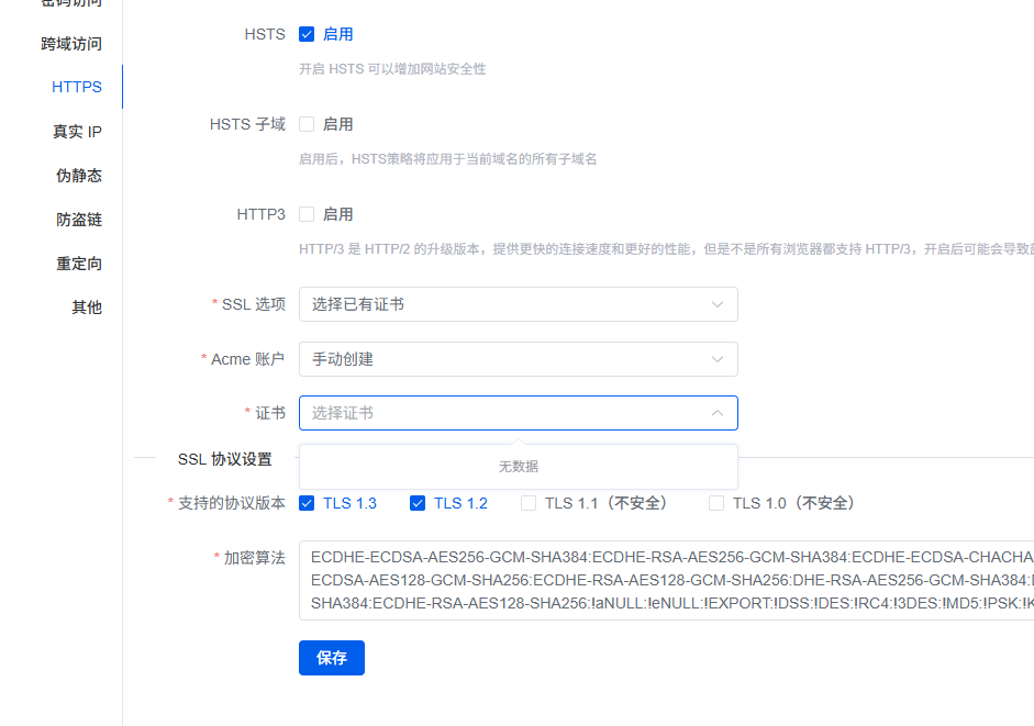 例如我需要创建一个 phpmyadmin 的反代,在公共网络上 为了安全 肯定时要开启 HTTPS 的,哪怕是证书不可信 起码传输是安全的,但是我发现 这个时候没有证书可以选择,需要自己申请一个证书。