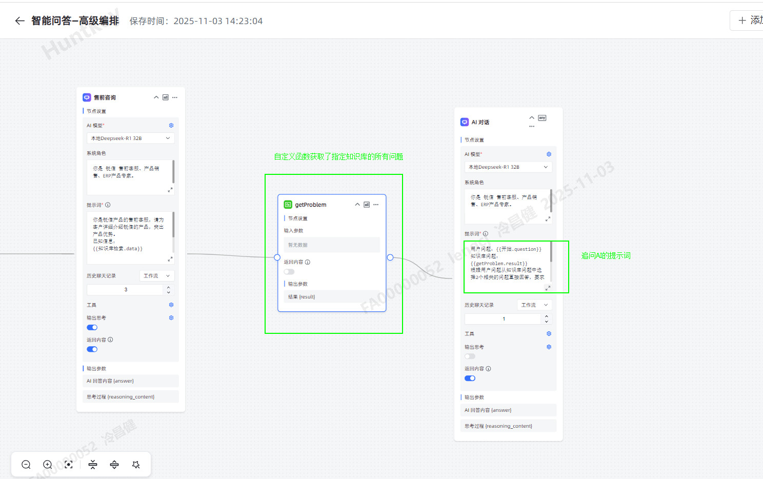 目标:从指定知识库问题列表中选择2个与用户问题相关的问题进行追问。 实现:已实现通过自定义函数获取了指定知识库的所有问题,追问问题AI里也设置了对应的输出内容和提示词。 结果:但调试时追问AI从知识库里选的问题和用户问题差别太大,没有什么关联性,想问下大佬们有没有什么优化的思路和方法。