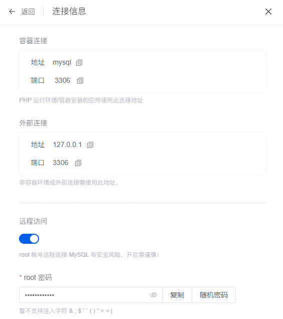 服务器:MySQL的容器名称(端口可加可不加) 用户名:默认root 密码:1p后台数据库tab中查看 image565×636 23.4 KB