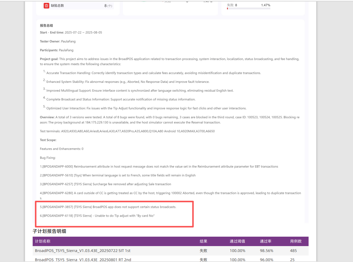 1.计划组测试报告生成后,填写报告总结,然后导出PDF,PDF中显示的总结内容信息会分页显示,但对应的总结内容会出现被截断的情况: