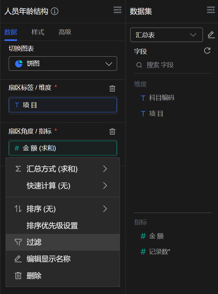明细表和汇总表中可以隐藏,饼图不可以
