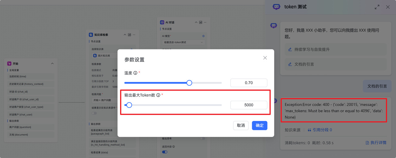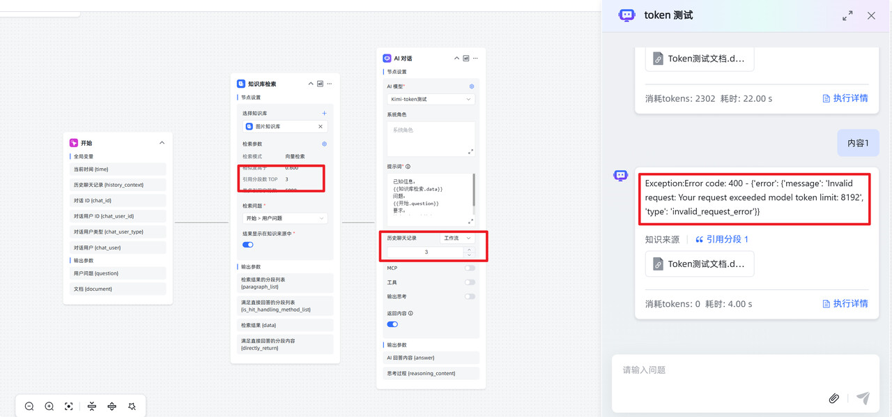 解决办法:减少引用分段数 TOP、减少历史聊天记录等。