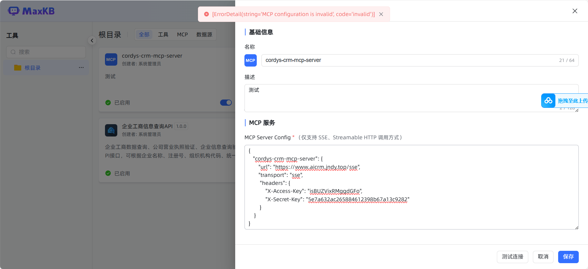 报错信息:[ErrorDetail(string=‘MCP configuration is invalid’, code=‘invalid’)]。