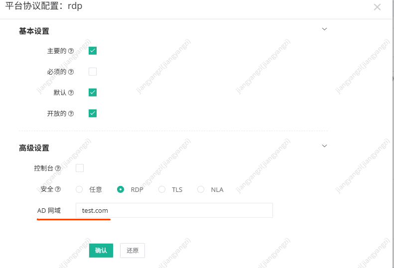1.系统设置->平台列表->新建Windows平台,协议选择RDP,配置高级设置"AD 网域"