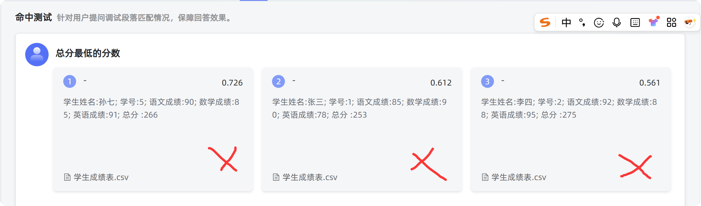 给文档“生成问题”也不行,向量模型用的是bmg3,如果需要如上的命中测试准确,是要单独创建这个问题(总分最低的分数)并进行关联吗?如果是这样,一个更复杂的表就不方便操作了。或者说更换向量模型?