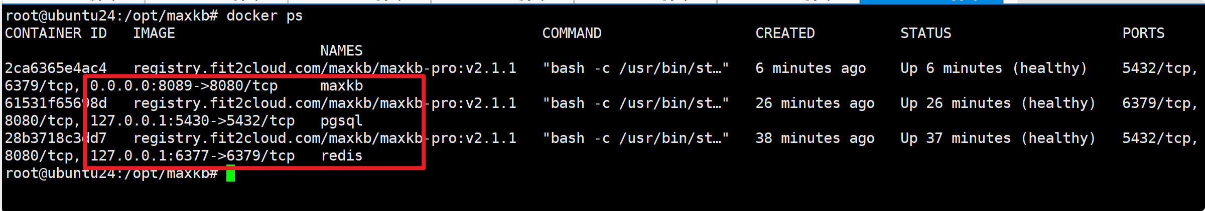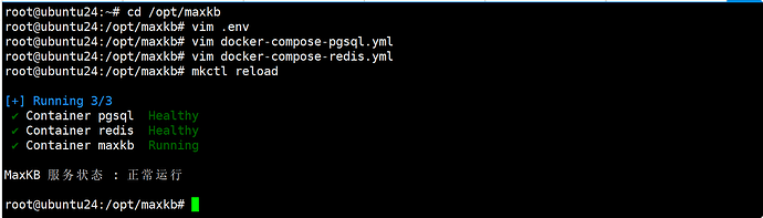 注意:如果要改内置数据库的服务端口,需要按照外部数据库进行配置,即修改 .env 文件、 maxkb.env 文件、 docker-compose.yml 文件。( postgres.conf 文件、 redis.conf 文件一般情况下不需要修改)