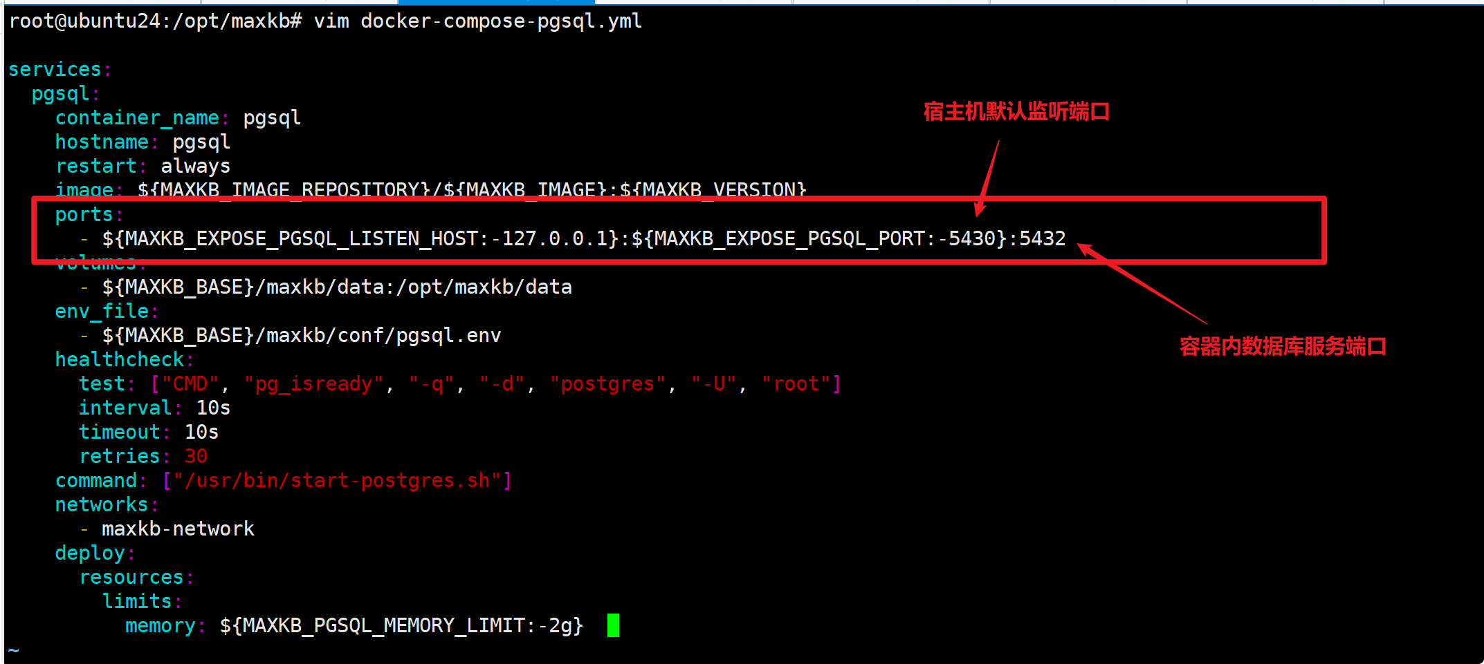 1、进入运行目录(${MAXKB_BASE}/maxkb/),修改 docker-compose-pgsql.yml 文件