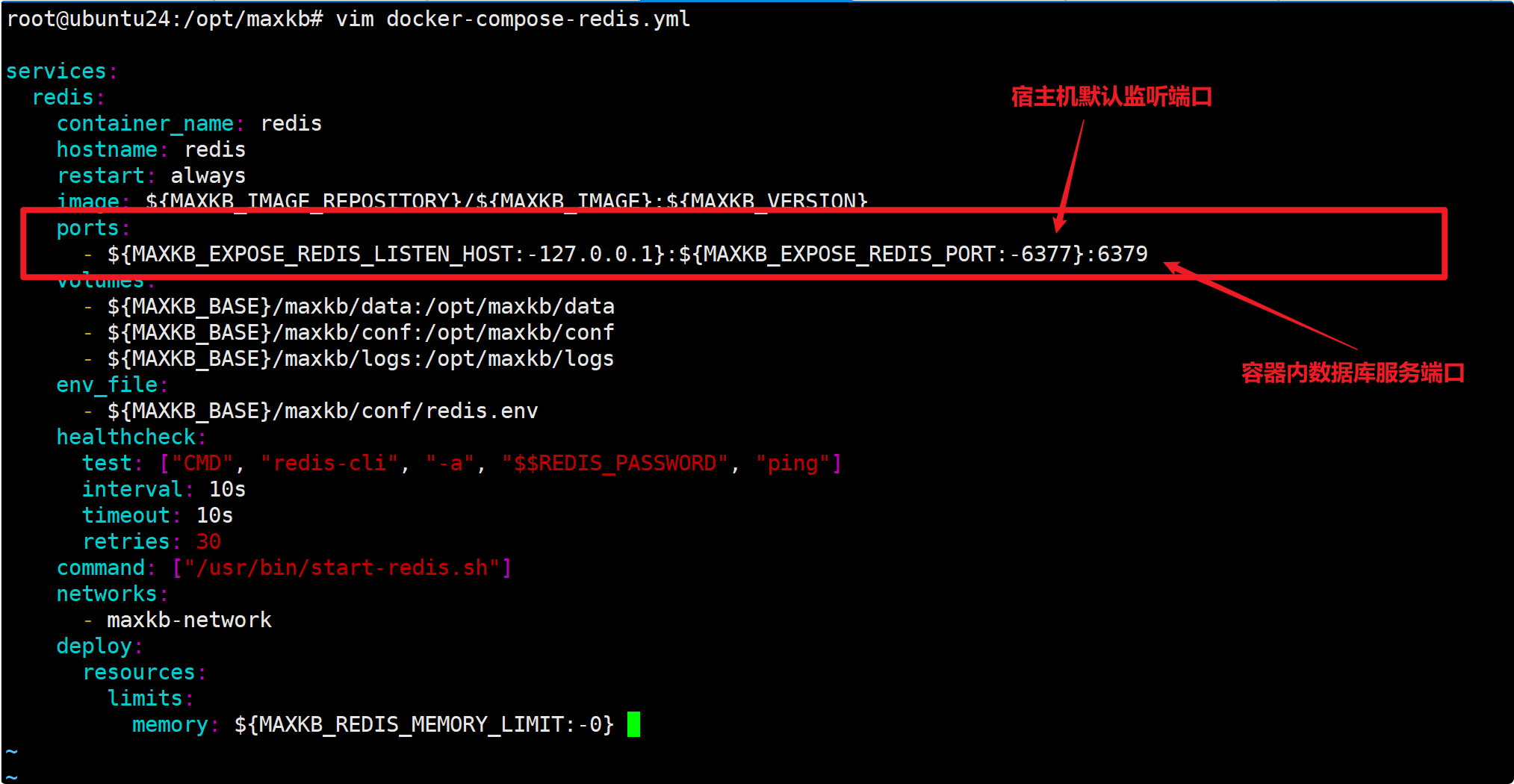 2、进入运行目录(${MAXKB_BASE}/maxkb/),修改 docker-compose-redis.yml 文件