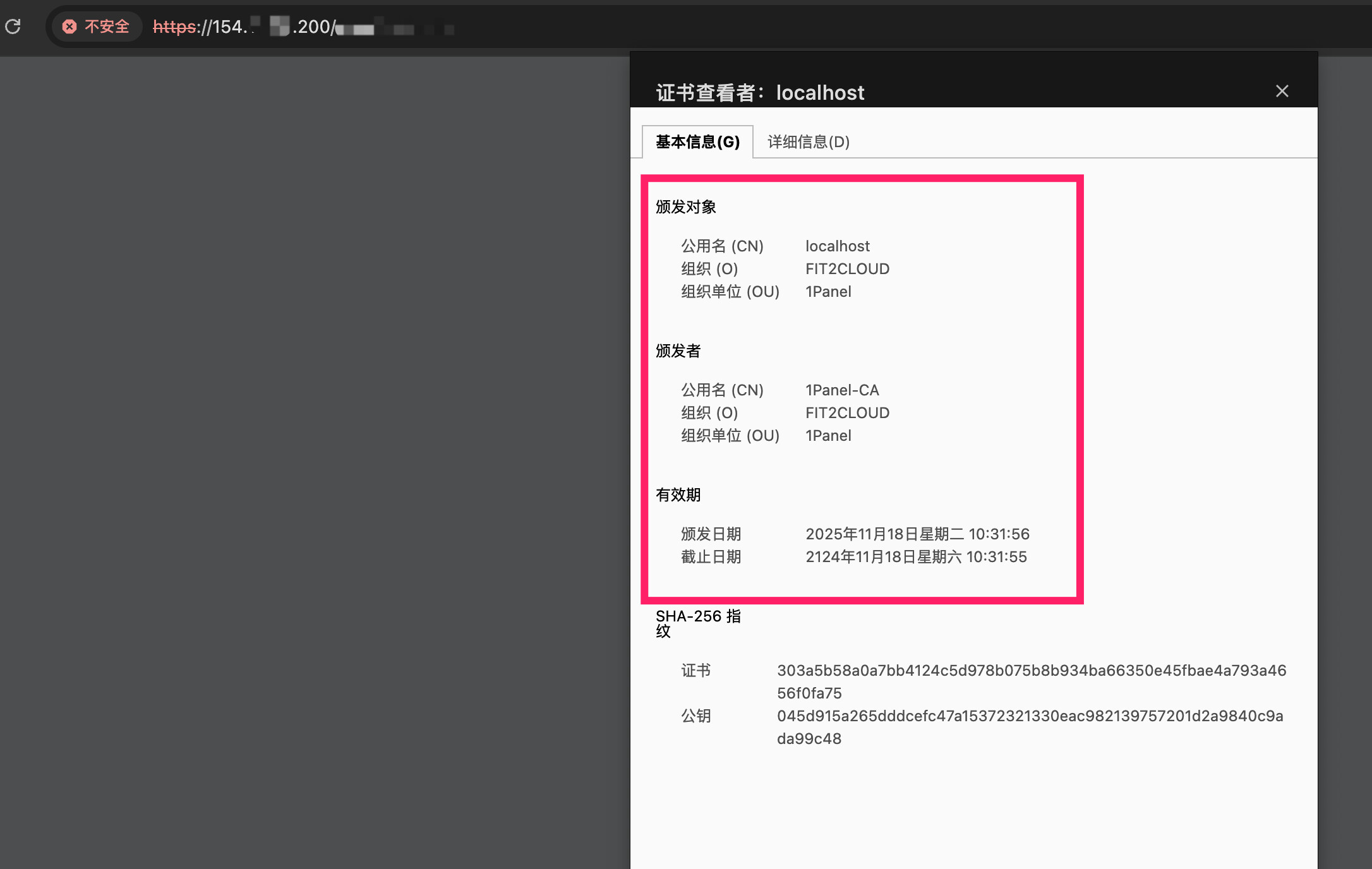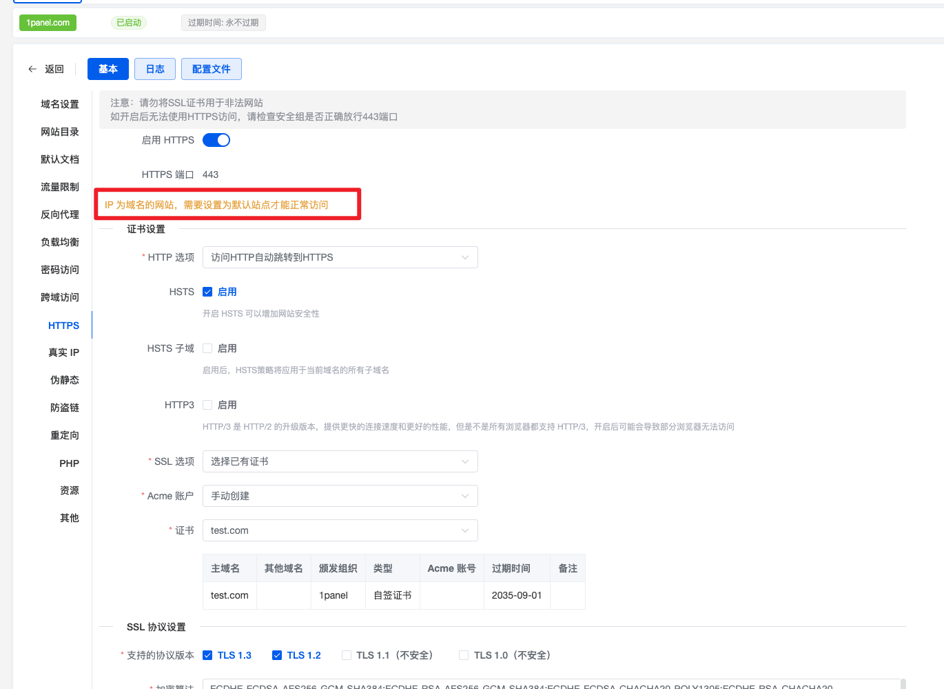 IP地址是购买的证书,IP创建的站也添加了证书。 但是在浏览器打开IP地址后为什么是1panel的证书?