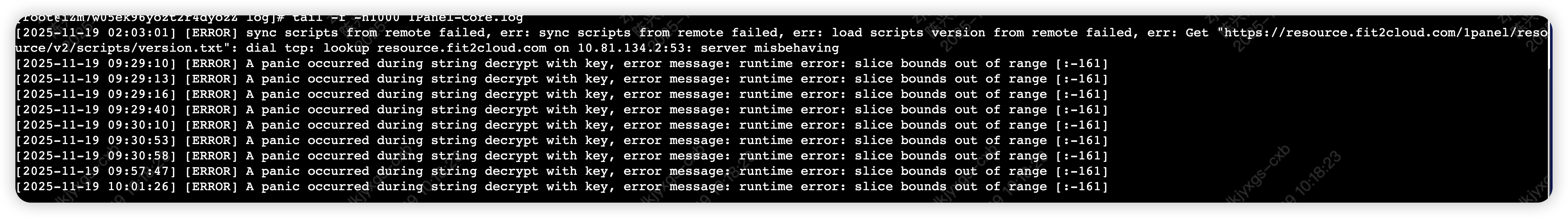 日志:A panic occurred during string decrypt with key, error message: runtime error: slice bounds out of range [:-161]
