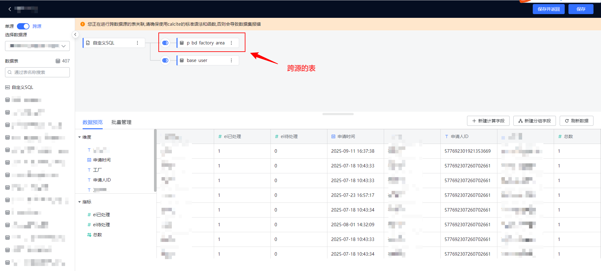 跨源数据集正常展示,使用查询组件时报错