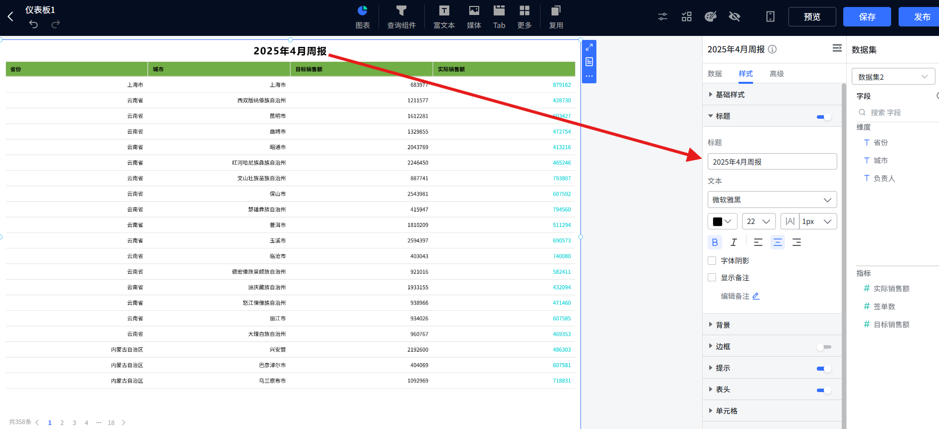 添加表头,可以将数据放到一张明细表中,编辑明细表选中样式中的标题,修改位置颜色以及大小,目前不支持导出带标题的excel