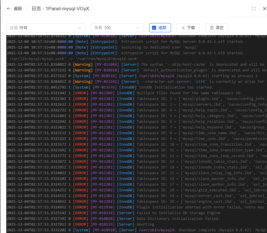 3、MySQL数据库恢复之后报错,内容为上面的截图,不太懂为什么会这样