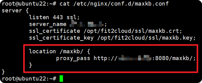 通过 HTTPS 监听 443 端口(借助 SSL 证书实现加密),将请求中以 /maxkb/ 开头的二级路径反向代理到目标 IP 的 8080 端口下的 /maxkb/ 服务