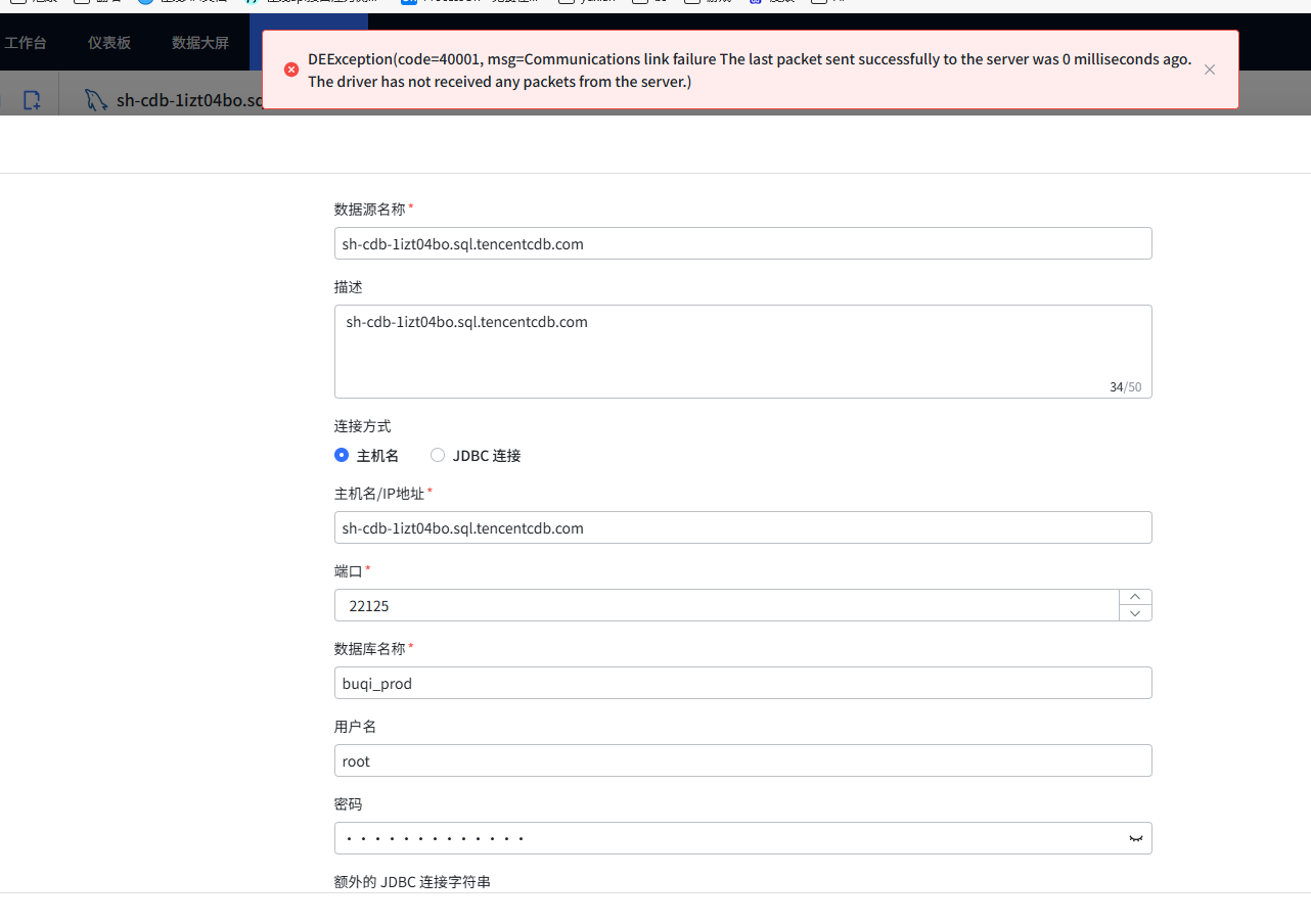io.dataease.exception.DEException: DEException(code=40001, msg=Communications link failure