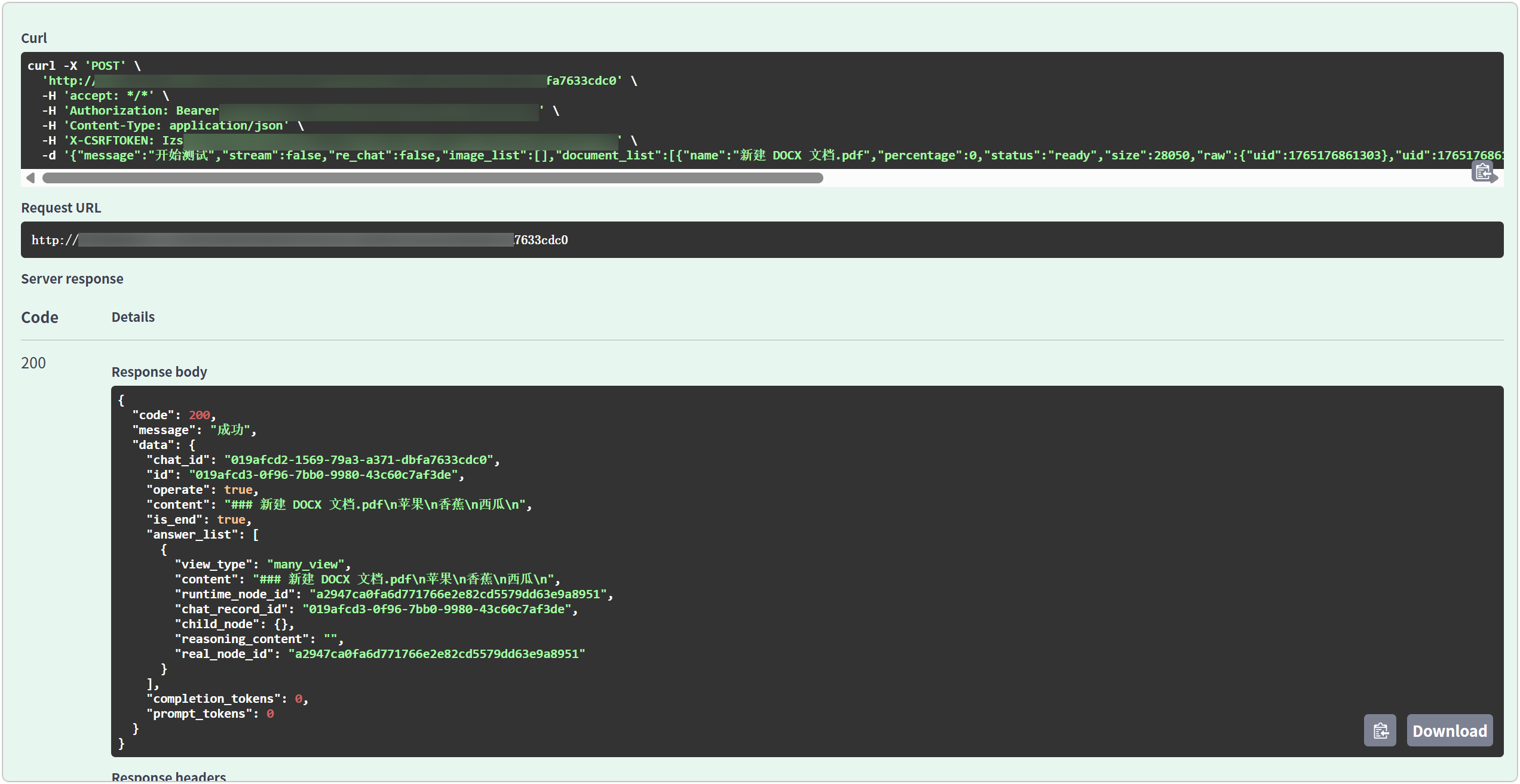 再调用 /chat/api/chat_message/{chat_id} 接口进行对话