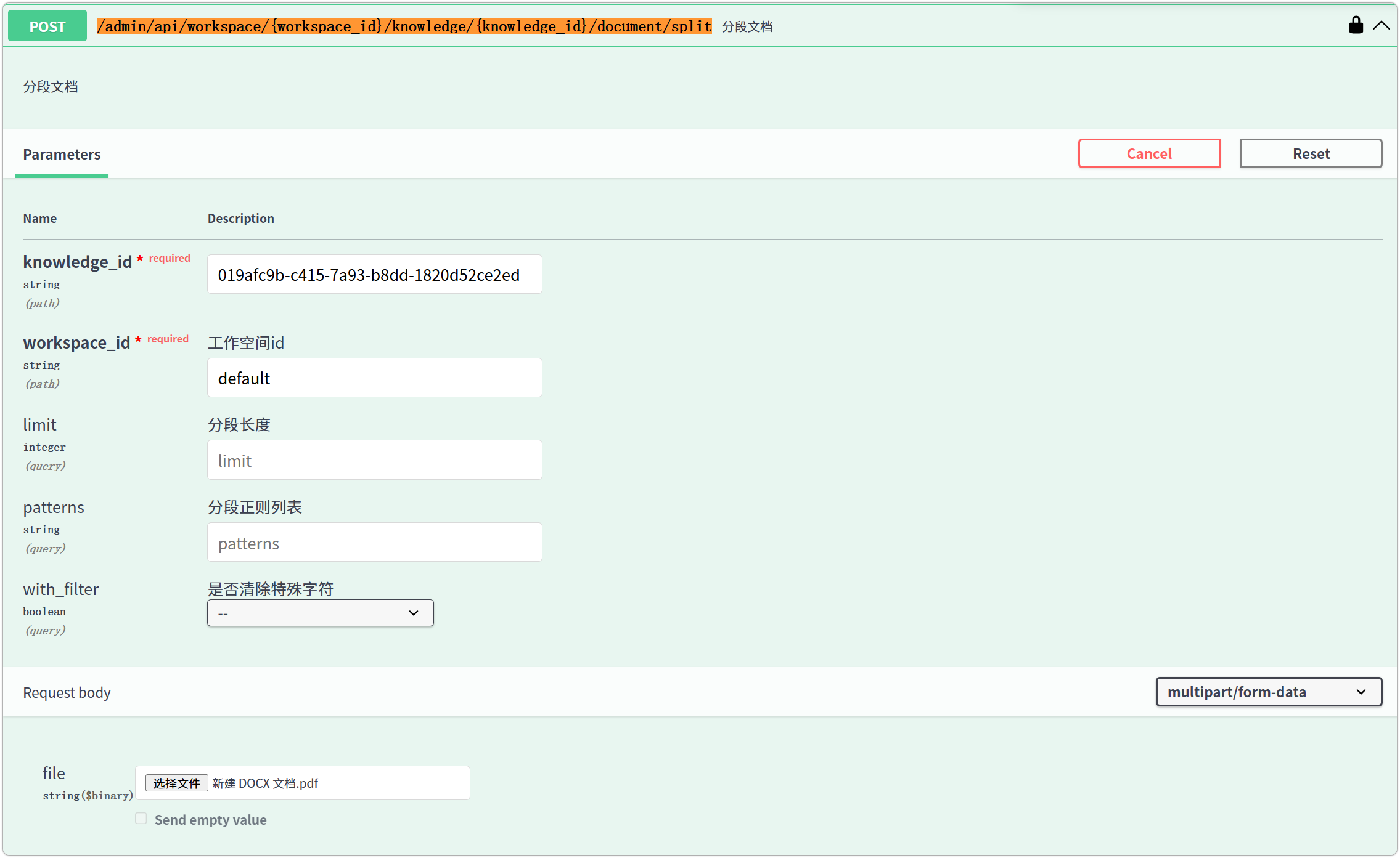 找到 /admin/api/workspace/{workspace_id}/knowledge/{knowledge_id}/document/split 接口,上传文件进行调试,获取响应结果中的 data 值