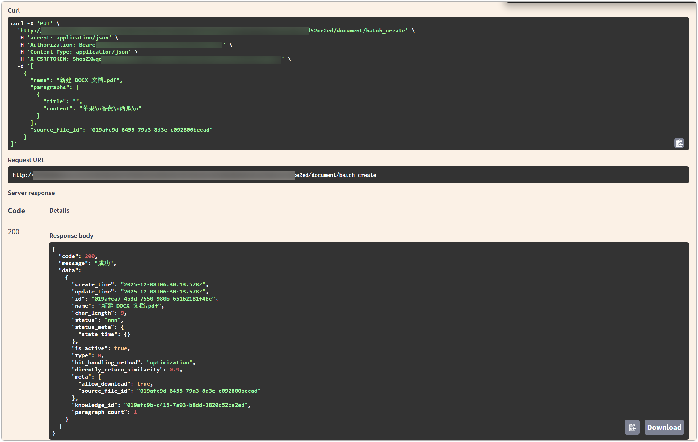 找到 /admin/api/workspace/{workspace_id}/knowledge/{knowledge_id}/document/batch_create 接口,传入请求参数进行调试