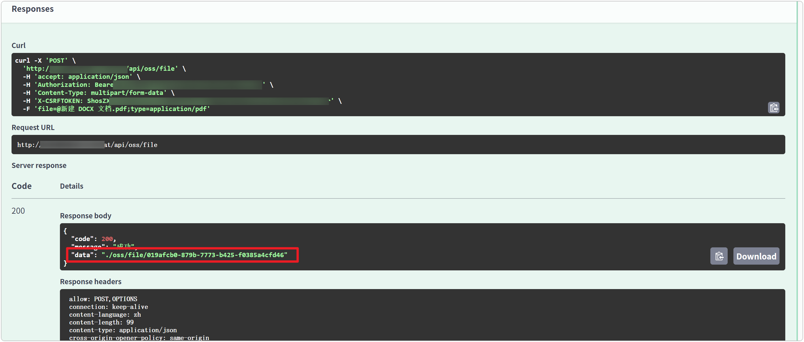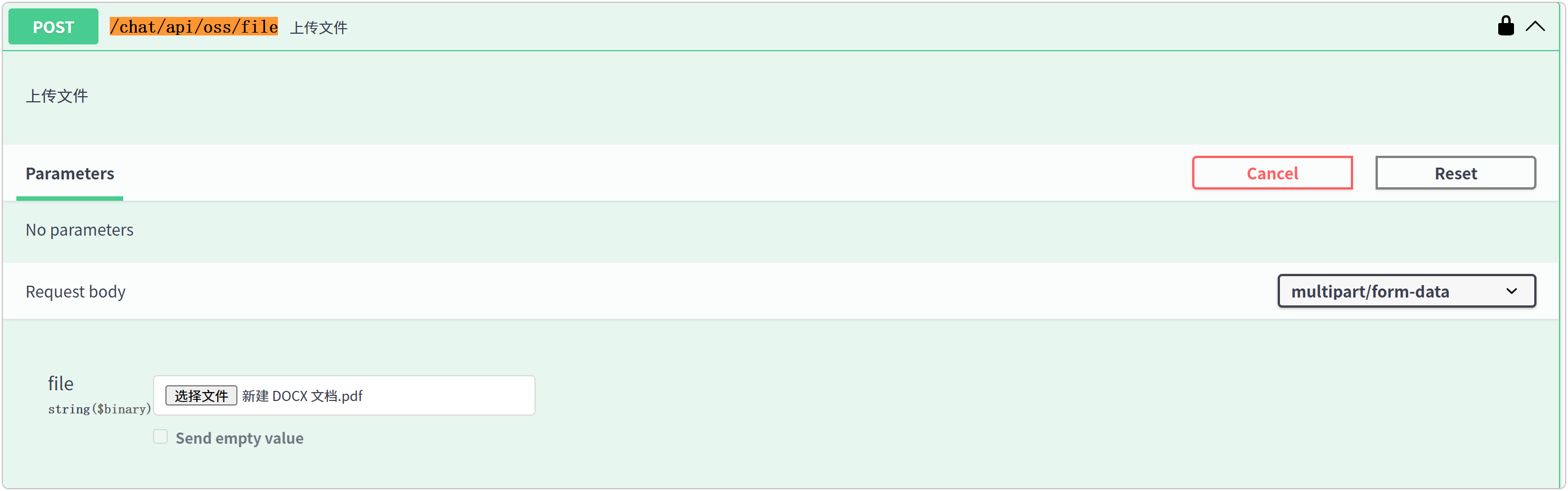 找到 /chat/api/oss/file 接口,上传文件进行调试,获取响应结果中的 data 值