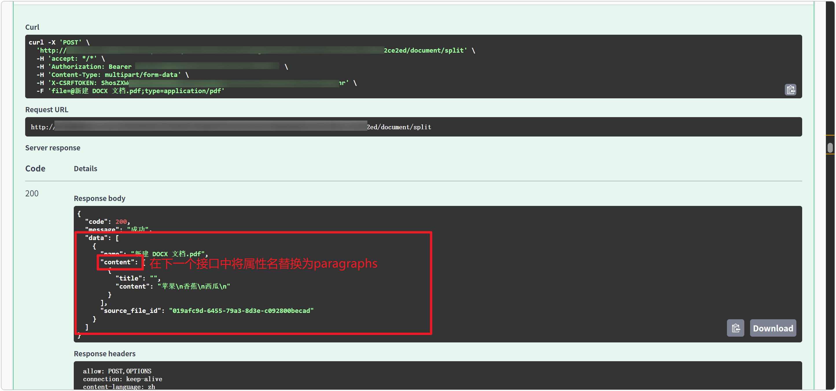 注意: 需要将上个接口响应结果中的属性名 content 改为 paragraphs