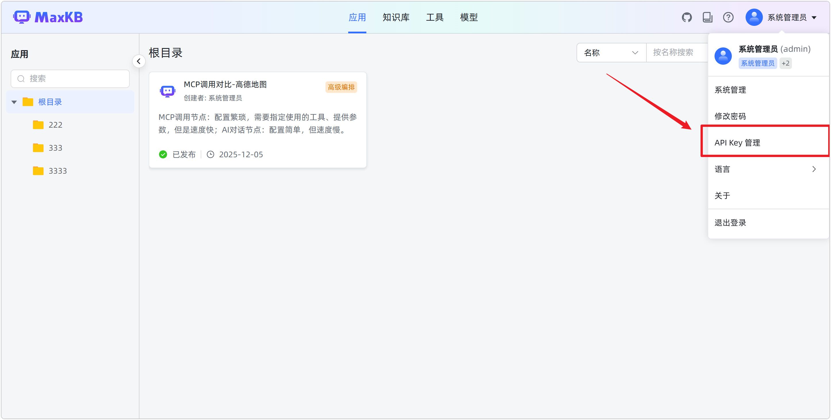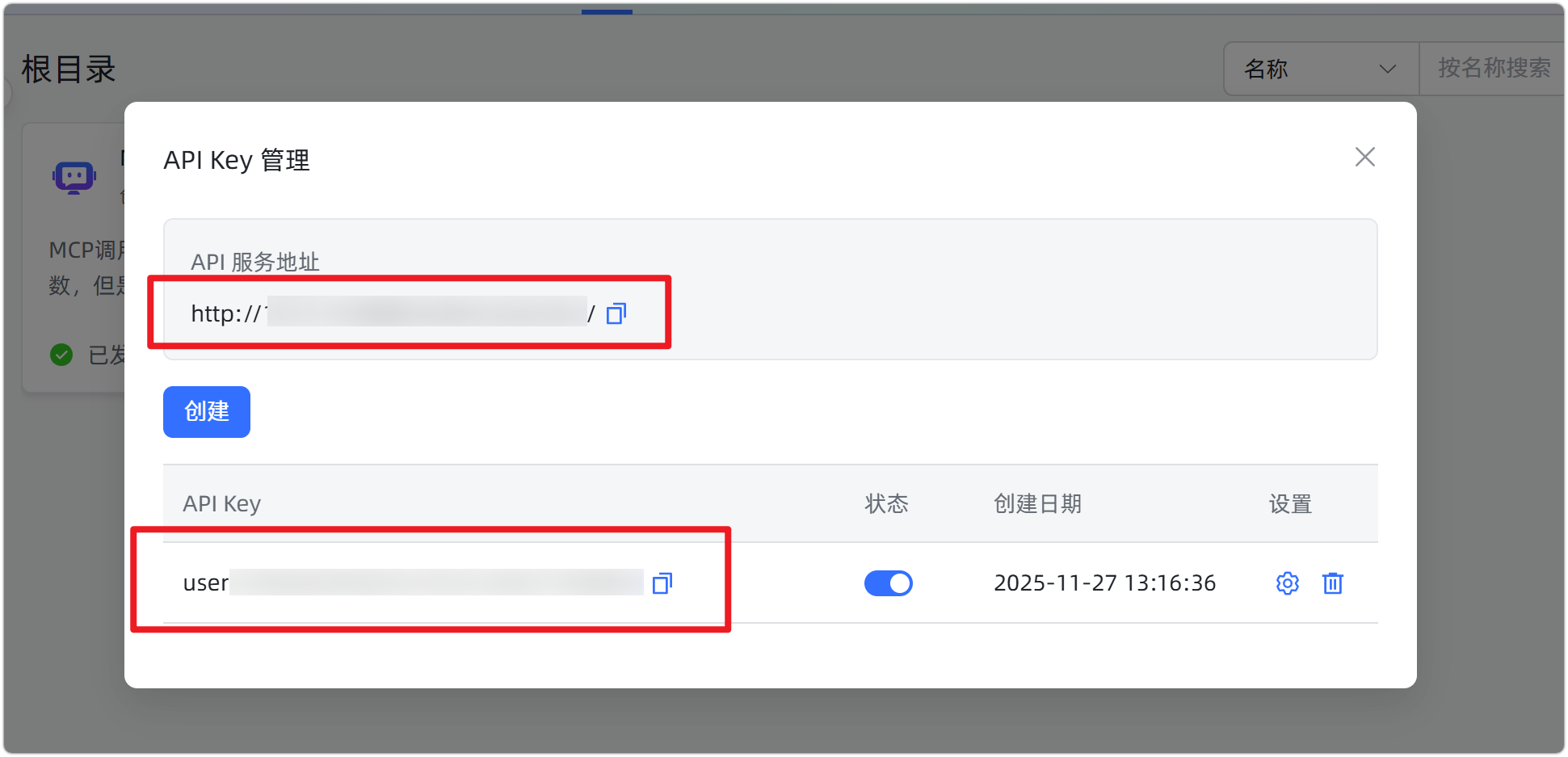 点击右上角的 API Key 管理,获取 API 服务地址 和 API Key