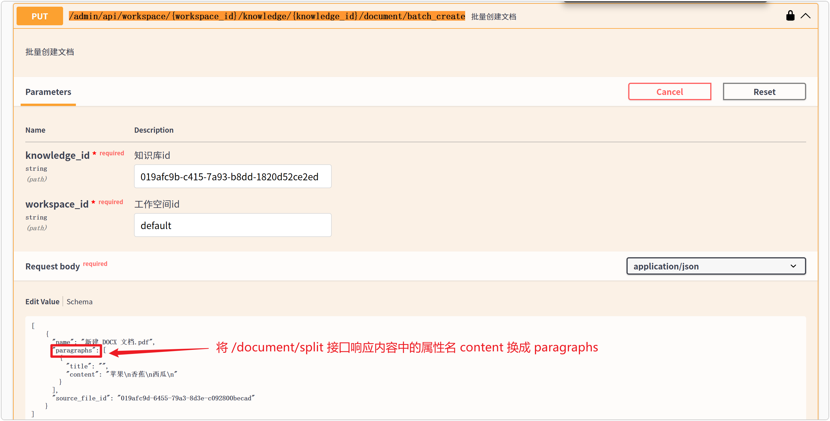 再调用 /admin/api/workspace/{workspace_id}/knowledge/{knowledge_id}/document/batch_create 创建文档接口。(接口参数来源 /admin/api/workspace/{workspace_id}/knowledge/{knowledge_id}/document/split 接口的响应结果)