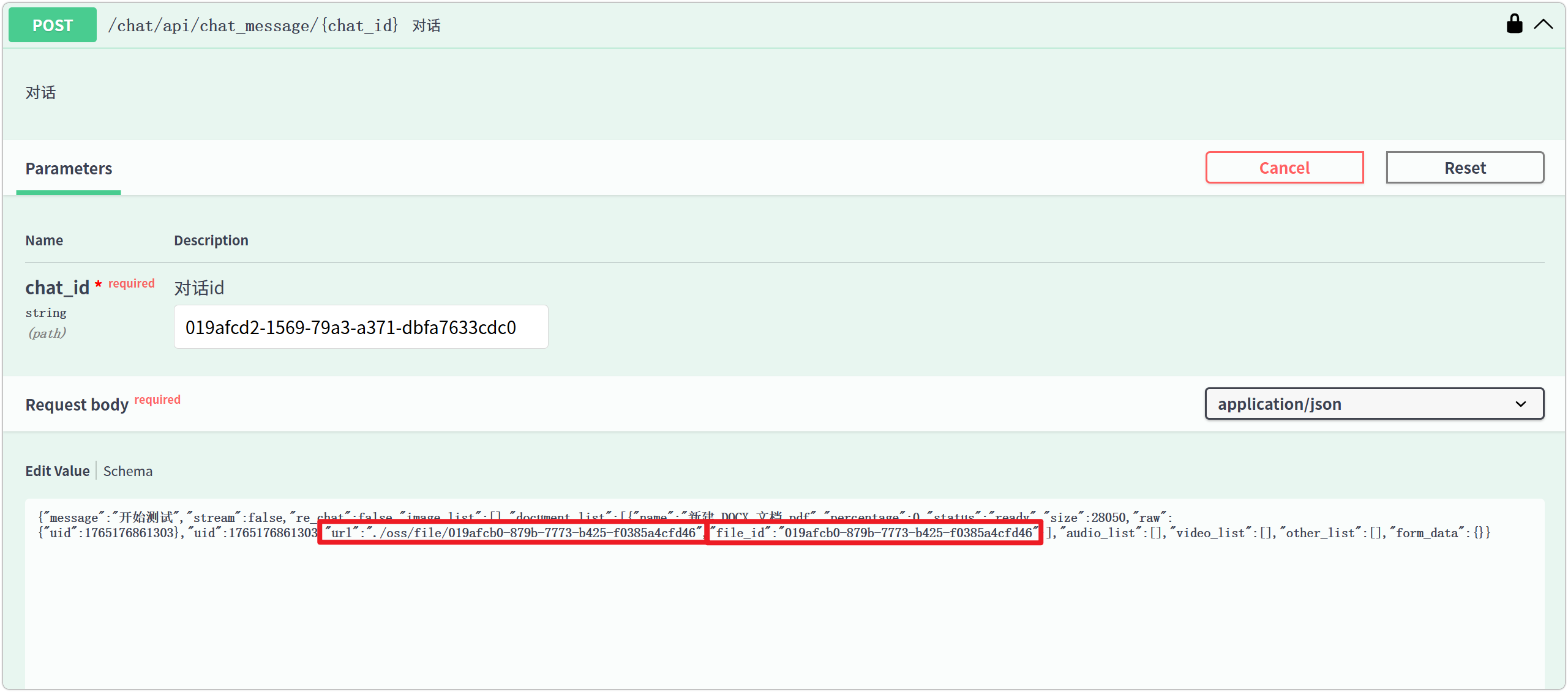 再调用 /chat/api/chat_message/{chat_id} 接口进行对话,将 /chat/api/oss/file 接口的返回值作为参数传入。