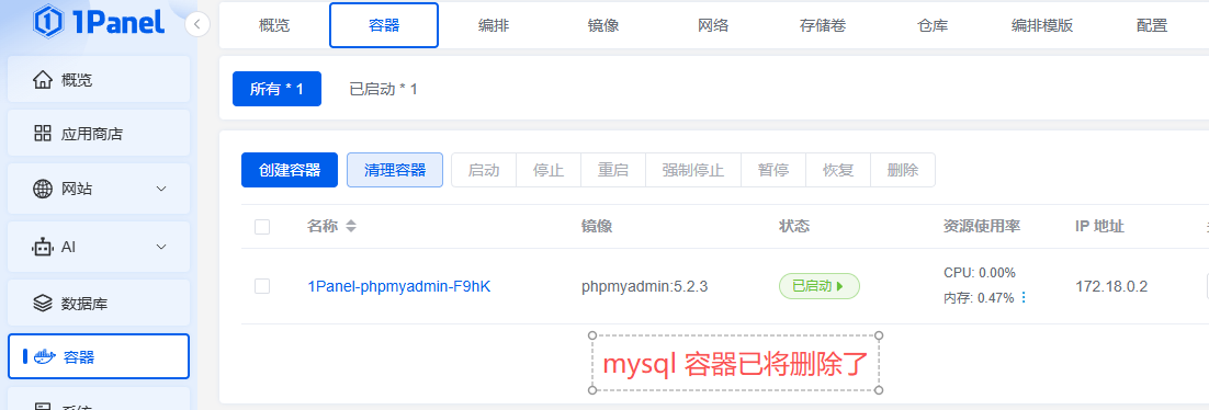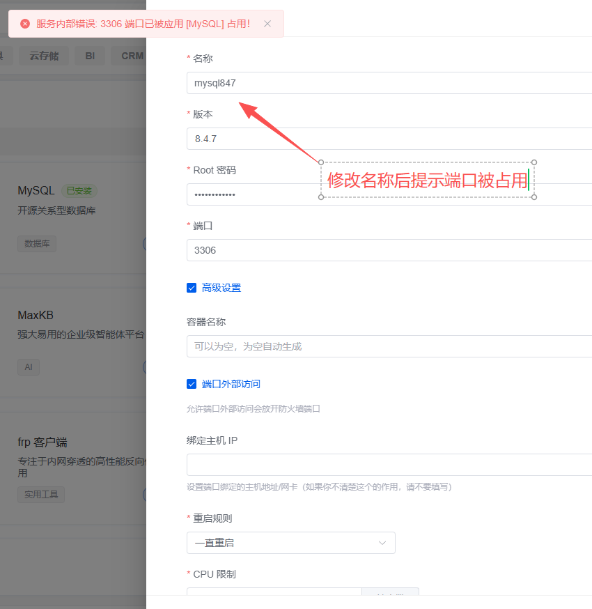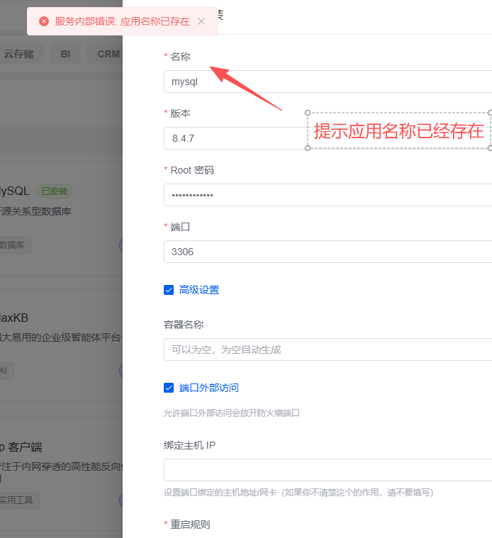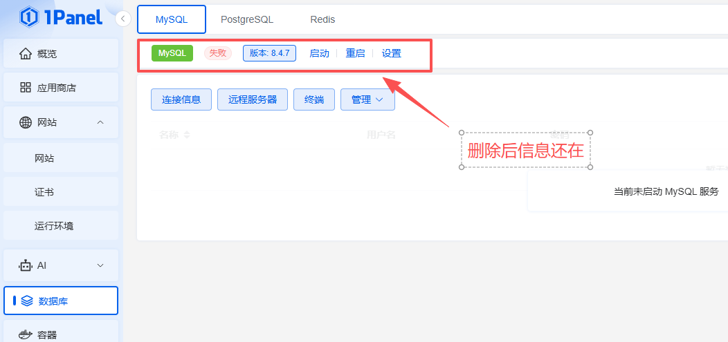 数据库mysql 删除后(包括容器和镜像),在应用商店重新安装mysql ,提示应用名称存在或者端口占用,已经把mysql 容器和镜像全部删除了,还是提示上述问题。在WEB界面-数据库-mysql 界面还能看到数据库的版本信息,是不是后台没有把信息删除干净。