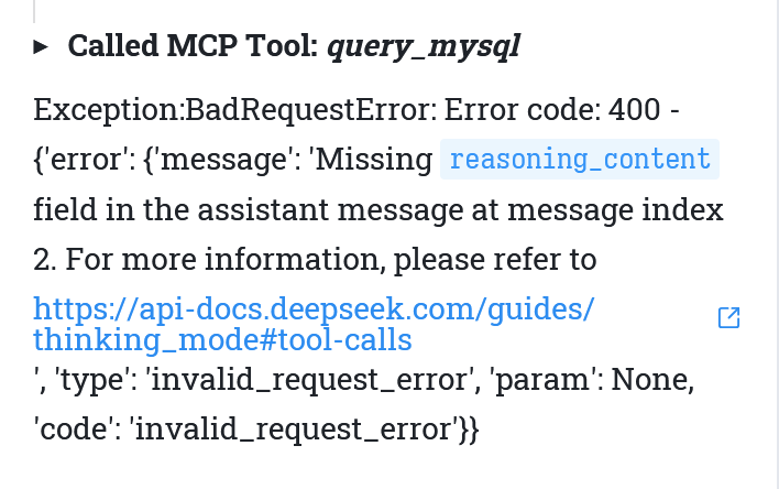 这个模型reasoning 模式要求每条 assistant 必须带 reasoning_content 字段,调用mcp返回的结果没有这个字段,这边换个其他模型测试一下呢?