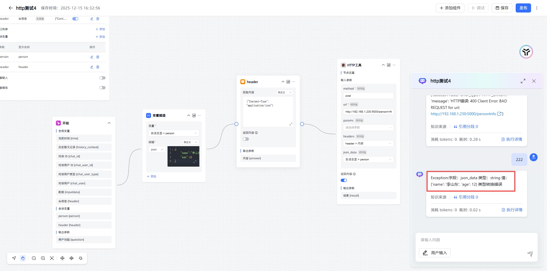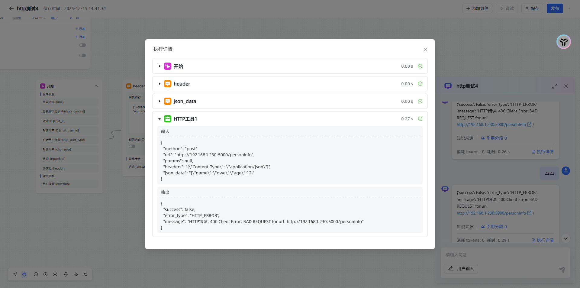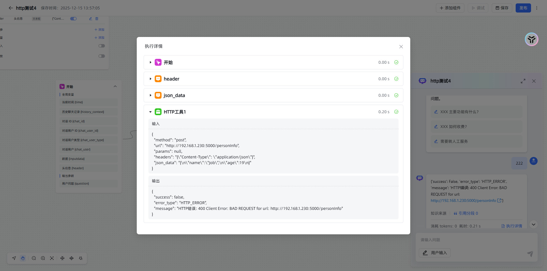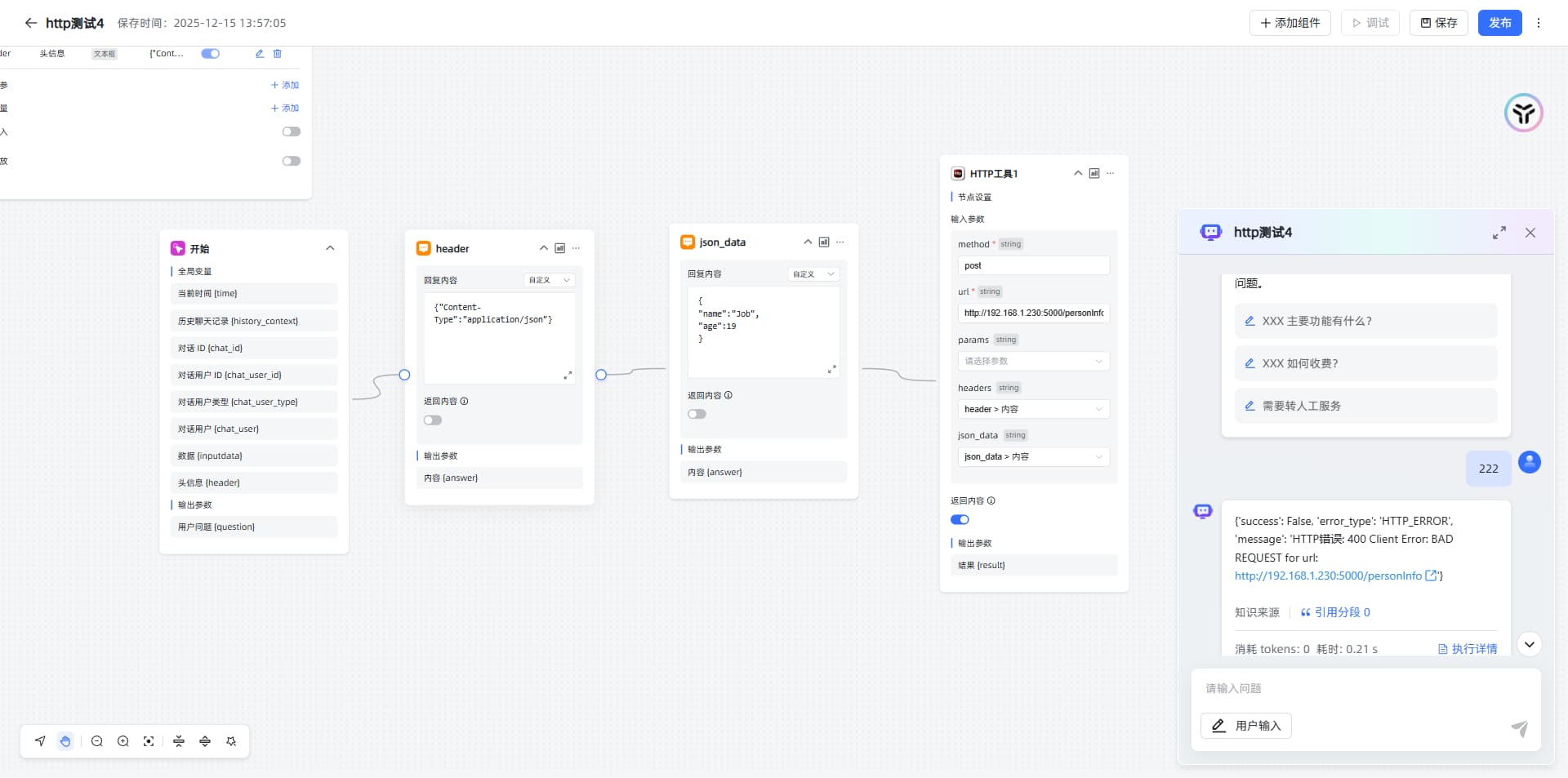 使用maxkb搭建工作流,写了一个最简单的验证http请求的工具,使用post请求,传参两个参数,但是一直提示400错误,使用postman测试接口没问题,可以正常响应。
