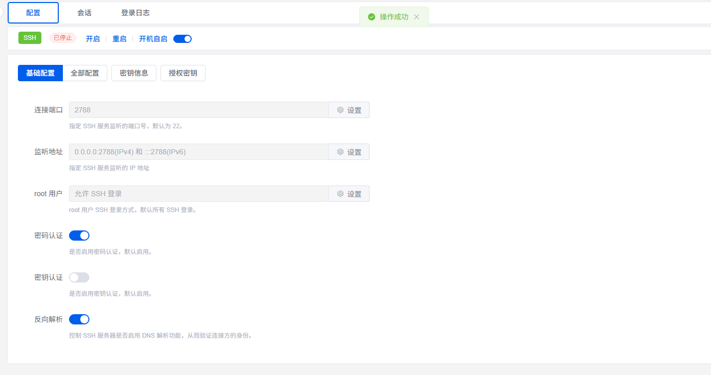 日志:开启提示开启成功 ,状态还是关闭终端也连不上,用其他的ssh也连不上,端口已放行