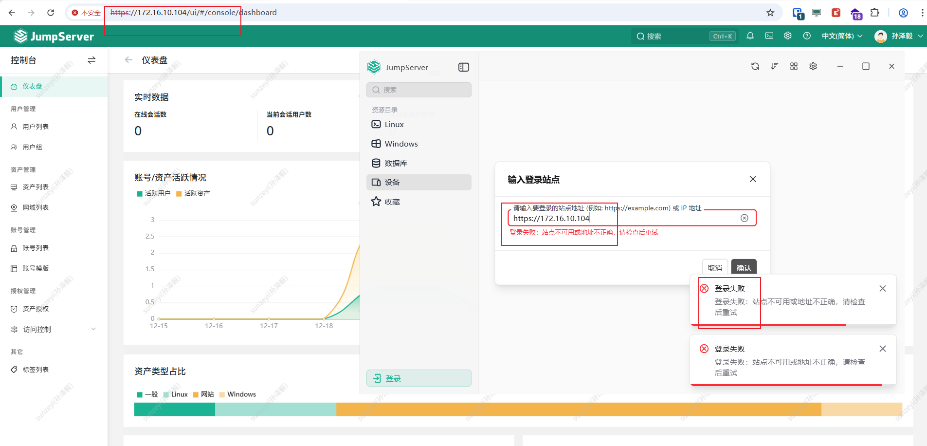 我们可以从两个方面去排查,第一个方面看看你的服务端的地址是否填写正确,端口有没有开放,第二个方面看看你的koko,lion组件有没有正常启动,jmscli status检查状态,并cd /data/jumpserver/core/data/logs/ 查看一下日志给出的报错信息